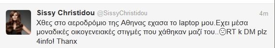 «Χθες στο αεροδρόμιο της Αθήνας εχασα το laptop μου. Έχει μέσα μοναδικές οικογενειακές στιγμές που χάθηκαν μαζί του.. plz 4info! Thanx», ήταν το λακωνικό της μήνυμα προς κάθε follower που ίσως γνωρίζει κάτι σχετικό.