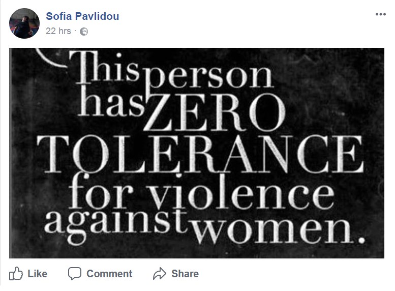 Ωστόσο, η Σοφία Παυλίδου έκανε μια ανάρτηση όλο νόημα στο Facebook. Συγκεκριμένα, δημοσίευσε μια εικόνα η οποία γράφει: “This person has zero tolerance for violence against women”.