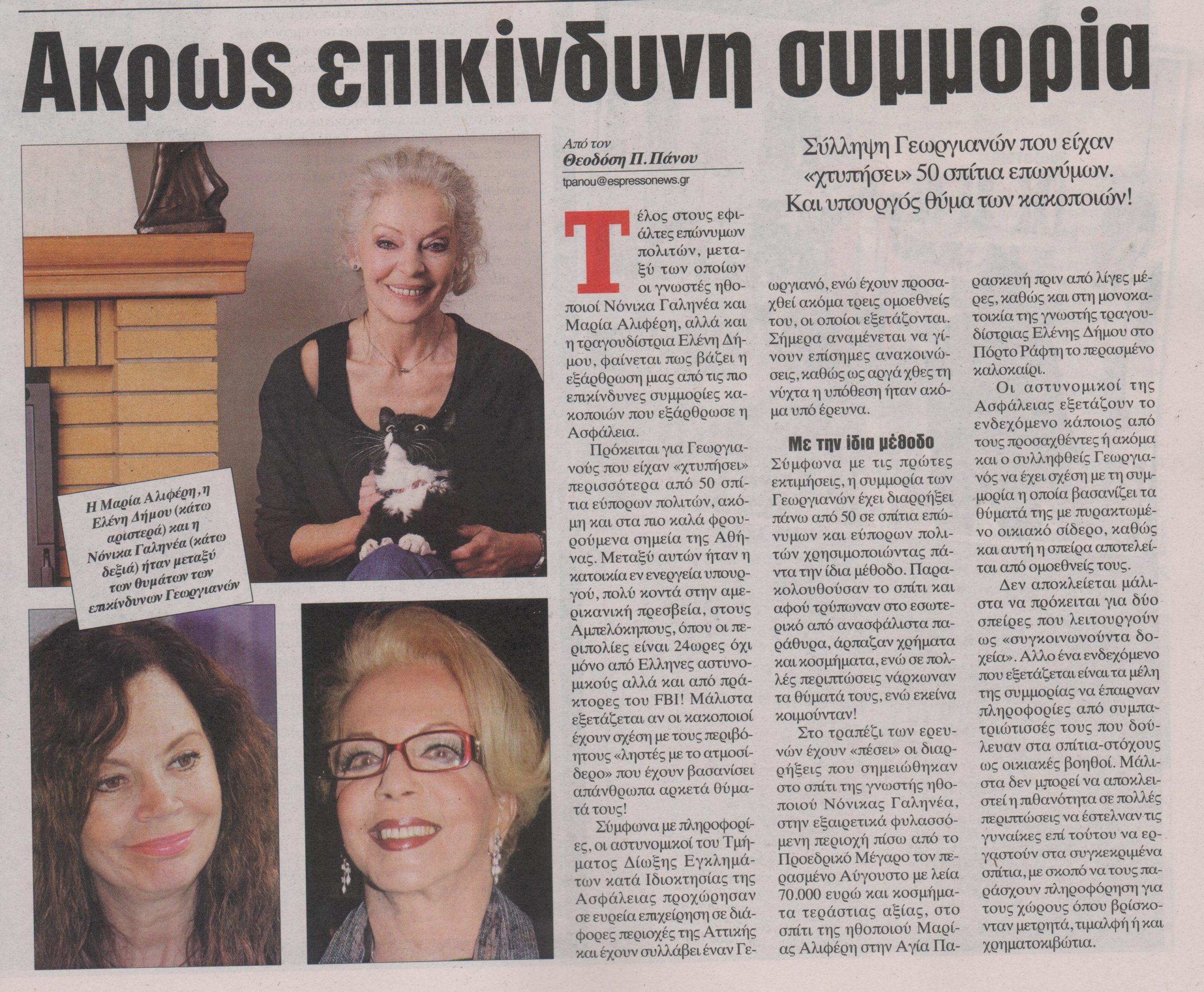 Τέλος στους εφιάλτες επωνύμων πολιτών, μεταξύ των οποίων οι γνωστοί ηθοποιοί Νόνικα Γαληνέα και Μαρία Αλιφέρη, αλλά και η τραγουδίστρια Ελένη Δήμου, φαίνεται πως βάζει η εξάρθρωση μιας από τις πιο επικίνδυνες συμμορίες κακοποιών που εξάρθρωσε η Ασφάλεια.