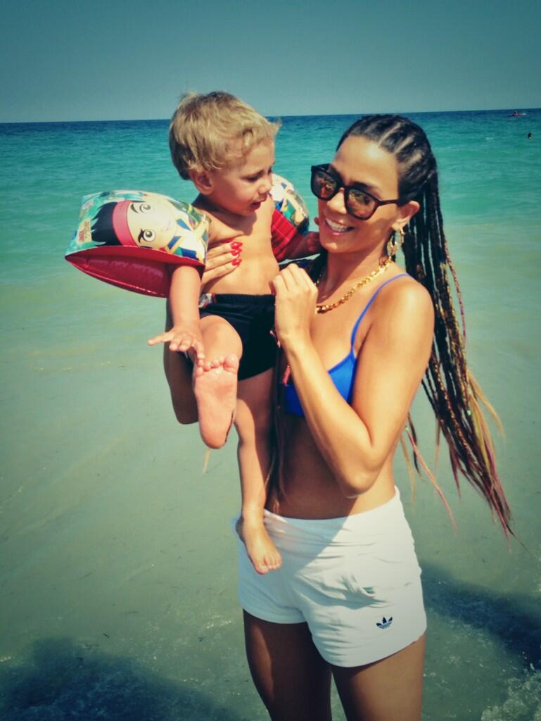 Ένα κατάξανθο αγόρι κρατάει στην αγκαλιά της η Κατερίνα Στικούδη. Η τραγουδίστρια βρίσκεται, όπως αναφέρει στην Λεπτοκαρυά Πιερίας, παρέα με έναν λιλιπούτειο φίλο της που φοράει μπρατσάκια.