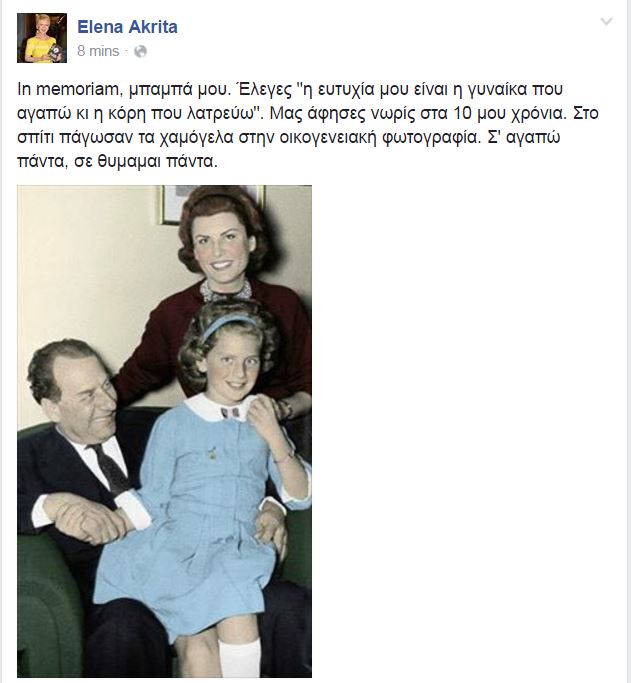 «In memoriam, μπαμπά μου. Έλεγες “η ευτυχία μου είναι η γυναίκα που αγαπώ κι η κόρη που λατρεύω”. Μας άφησες νωρίς στα 10 μου χρόνια. Στο σπίτι πάγωσαν τα χαμόγελα στην οικογενειακή φωτογραφία. Σ’ αγαπώ πάντα, σε θυμάμαι πάντα.