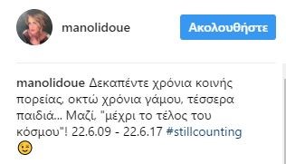 “Δεκαπέντε χρόνια κοινής πορείας, οκτώ χρόνια γάμου, τέσσερα παιδιά… Μαζί, “μέχρι το τέλος του κόσμου”! 22.6.09 – 22.6.17 #stillcounting” έγραψε η Ευγενία Μανωλίδου ανεβάζοντας παράλληλα φωτογραφίες από τον γάμο της με τον αντιπρόεδρο της ΝΔ.