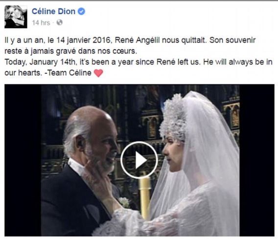 «Σήμερα, 14 Ιανουαρίου, κλείνει ένας χρόνος από όταν ο Ρενέ μας άφησε. Θα είναι πάντα μέσα στις καρδιές μας» ήταν τα τρυφερά λόγια με τα οποία η Σελίν Ντιον συνόδευσε το βίντεο που ανέβασε στο facebook.