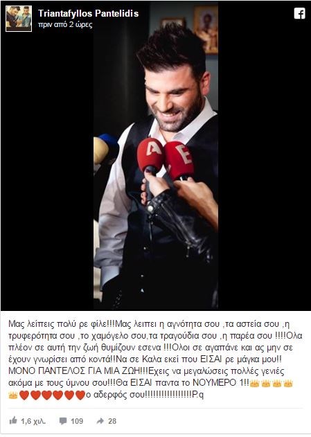 Μία συγκινητική ανάρτηση για τον αδικοχαμένο τραγουδιστή, Παντελή Παντελίδη έκανε πριν από λίγο στο προφίλ του στο Facebook ο αδελφός του, Τριαντάφυλλος.”Μας λείπεις πολύ ρε φίλε!!! Μας λείπει η αγνότητα σου ,τα αστεία σου ,η τρυφερότητα σου ,το χαμόγελο σου, τα τραγούδια σου ,η παρέα σου !!!! Όλα πλέον σε αυτή την ζωή θυμίζουν εσένα !!! Όλοι σε αγαπάνε και ας μην σε έχουν γνωρίσει από κοντά!! Να σε Καλά εκεί που ΕΙΣΑΙ ρε μάγκα μου!! ΜΟΝΟ ΠΑΝΤΕΛΟΣ ΓΙΑ ΜΙΑ ΖΩΗ!!! Έχεις να μεγαλώσεις πολλές γενιές ακόμα με τους ύμνους σου!!! Θα ΕΙΣΑΙ πάντα το ΝΟΥΜΕΡΟ 1″ έγραψε μεταξύ άλλων ο αδελφός του αδικοχαμένου τραγουδιστή…Δείτε την ανάρτηση: