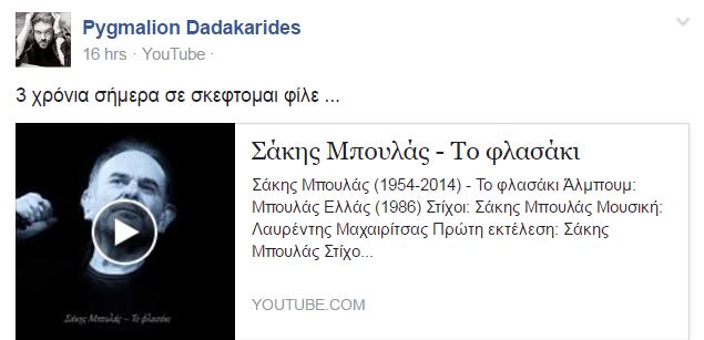 Ο ηθοποιός Πυγμαλιών Δαδακαρίδης, ο οποίος είχε συνεργαστεί με τον Σάκη Μπουλά, δεν ξέχασε τον αγαπημένο καλλιτέχνη και έγραψε στον λογαριασμό του στο Facebook: «3 χρόνια σήμερα σε σκέφτομαι φίλε…»