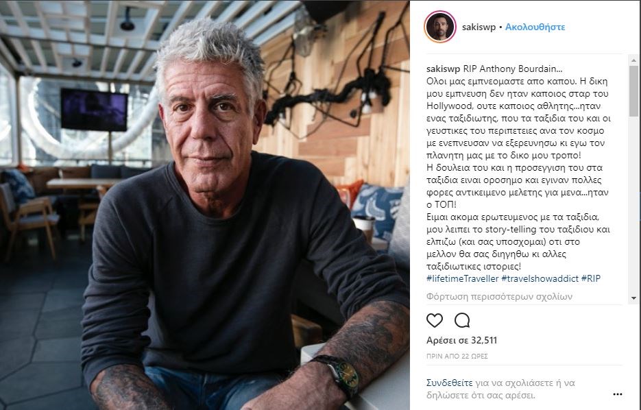 «Όλοι μας εμπνεόμαστε από κάπου. Η δική μου έμπνευση δεν ήταν κάποιος σταρ του Hollywood, ούτε κάποιος αθλητής… ήταν ένας ταξιδιώτης, που τα ταξίδια του και οι γευστικές του περιπέτειες ανά τον κόσμο με ενέπνευσαν να εξερευνήσω κι εγώ τον πλανήτη μας με τον δικό μου τρόπο. Η δουλειά του και η προσέγγισή του στα ταξίδια είναι ορόσημο και έγιναν πολλές φορές αντικείμενο μελέτης για μένα… ήταν ο ΤΟΠ! Είμαι ακόμα ερωτευμένος με τα ταξίδια, μου λείπει το story-telling του ταξιδιού και ελπίζω (και σας υπόσχομαι) ότι στο μέλλον θα σας διηγηθώ κι άλλες ταξιδιωτικές ιστορίες!», έγραψε χαρακτηριστικά στο Instagram.