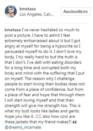 Η Κόνι Μεταξά συχνά ανεβάζει στον προσωπικό της λογαριασμό στο Instagram εντυπωσιακές φωτογραφίες από στιγμές της καθημερινότητάς της.Ωστόσο, η κόρη του Λευτέρη Πανταζή, αποφάσισε για πρώτη φορά να αναρτήσει μία φωτογραφία της, όπου παρουσιάζει τις ατέλειές του σώματός της, προτρέποντας όλους να αγαπούν τον εαυτό τους και το σώμα τους όπως είναι.«Δεν έχω διστάσει ξανά τόσο πολύ, να δημοσιεύσω μια φωτογραφία. Πρέπει να παραδεχτώ ότι αισθάνομαι εξαιρετικά ντροπιασμένη για αυτό, αλλά θυμήθηκα ότι είμαι υποκριτής κι έτσι έπεισα τον εαυτό μου να το κάνω… δεν αγαπώ το σώμα μου, προσπαθώ πραγματικά σκληρά, αλλά η αλήθεια είναι ότι δεν το κάνω. Έχω παιδευτεί με τις διατροφικές διαταραχές για μεγάλο χρονικό διάστημα και έσπασε το σώμα και το μυαλό μου με τα βάσανα που έβαλα στον εαυτό μου. Ο λόγος για τον οποίο προτρέπω τους ανθρώπους να αρχίσουν να αγαπούν το σώμα τους δεν προέρχεται από μια θέση εμπιστοσύνης, αλλά από μια θέση φόβου και ελπίδας ότι μέσω αυτών θα αρχίσω να αγαπάω τον εαυτό μου και ότι η δύναμή τους θα μου δώσει και δύναμη!», ήταν η λεζάντα που συνόδευε την ανάρτηση της Κόνι Μεταξά.