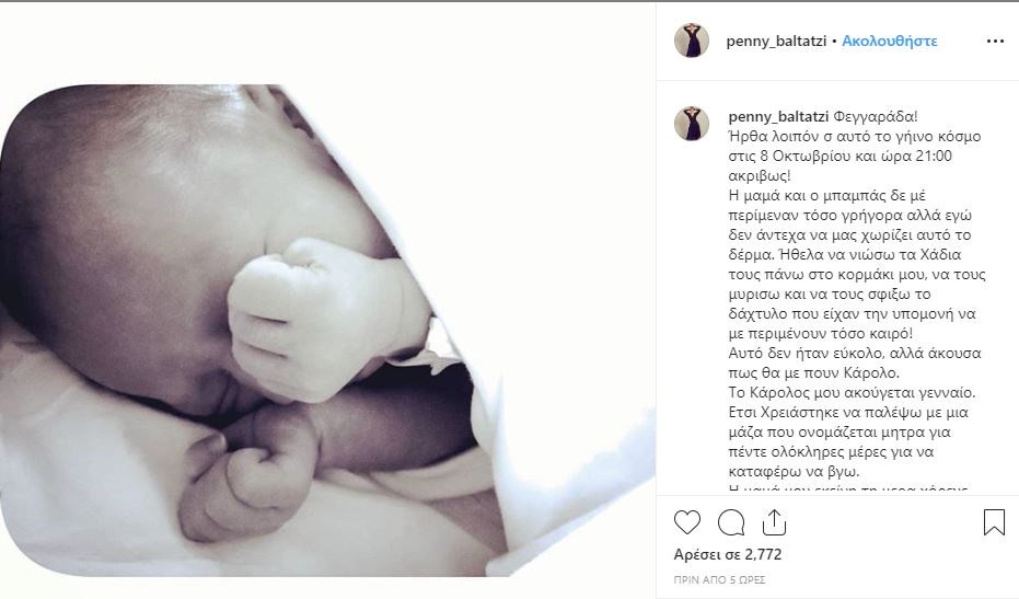 Πριν από πέντε ημέρες έφερε στον κόσμο το όμορφο μωράκι της, τον γιο της, τον οποίο μάλιστα σκοπεύουν με τον σύζυγό της να τον ονομάσουν Κάρολο. Το “μαρτύρησε” η ίδια σε ανάρτησή της στο Instagram όταν γεννήθηκε ο μικρός. Ο λόγος για την Πέννυ Μπαλτατζή, η οποία επανήλθε με μια νέα, τρυφερή και συγκινητική ανάρτηση στο Instagram, όπου ανέβασε μια φωτογραφία του μωρού της να κοιμάται με την ίδια να δηλώνει τρισευτυχισμένη.