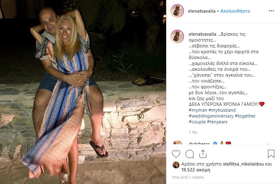Η Έλενα Τσαβαλιά ανέβασε μία κοινή τους φωτογραφία στο Instagram και έγραψε: “Βρίσκεις τις ομοιότητες… σέβεσαι τις διαφορές… του κρατάς το χέρι σφιχτά στα δύσκολα… χαμογελάς διπλά στα εύκολα… ακολουθείς τα όνειρά του… “χάνεσαι” στην αγκαλιά του… τον νοιάζεσαι… τον φροντίζεις… με δυο λόγια…τον αγαπάς… και ζεις μαζί του. Δέκα υπέροχα χρόνια γάμου!”.