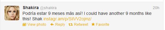 Η 35χρονη τραγουδίστρια Σακίρα δημοσίευσε στον προσωπικό της λογαριασμό στο twitter μια τρυφερή φωτογραφία στην οποία δείχνει την κοιλίτσα της, ενώ είναι ξαπλωμένη πάνω στον σύντροφό της, Πικέ.