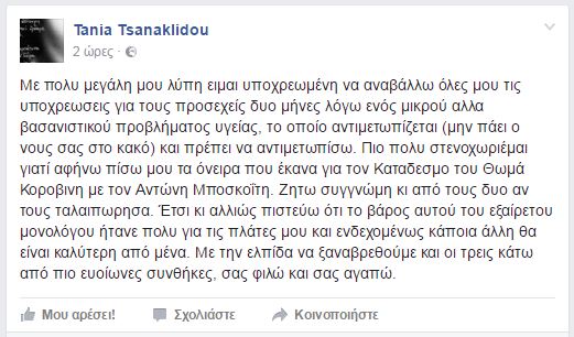 Την αναβολή όλων των επαγγελματικών υποχρεώσεων της ανακοίνωσε η Τάνια Τσανακλίδου μέσα από το προφίλ της στο facebook λόγω “ενός μικρού, αλλα βασανιστικού προβλήματος υγείας”, όπως έγραψε χαρακτηριστικά.