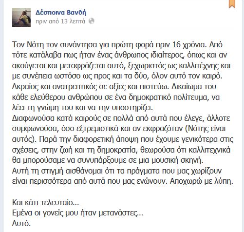 Η Δέσποινα Βανδή και ο Νότης Σφακιανάκης ήταν έτοιμοι να ενώσουν τις φωνές τους το φετινό χειμώνα. Ωστόσο, λίγο πριν από την πρεμιέρα τους, η γνωστή τραγουδίστρια αποφάσισε να αποχωρήσει από το σχήμα, με αφορμή τις δηλώσεις του συναδέλφου της για την Χρυσή Αυγή. Το ανακοίνωσε η ίδια μέσω της σελίδας της στο Facebook.
