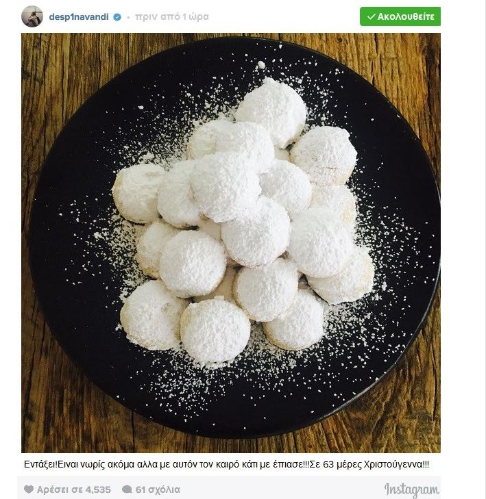 Έτσι «ανέβασε» φωτογραφία δείχνοντας τους κουραμπιέδες που έκανε σημειώνοντας, πάντως, ότι είναι λίγο νωρίς γι’αυτό το γλυκό.