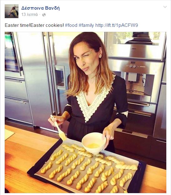 Η Δέσποινα Βανδή μπήκε πρωί πρωί στην κουζίνα της και έφτιαξε κουλουράκια. Η τραγουδίστρια πόσταρε την παρακάτω φωτογραφία σχολιάζοντας ότι φτιάχνει κουλουράκια για το Πάσχα και την οικογένεια.