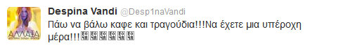 Η Δέσποινα Βανδή μας ενημερώνει μέσα απο το twitter της για την κυκλοφορία του καινούργιου της cd αλλά και ποιο είναι το αγαπημένο της τραγούδι…