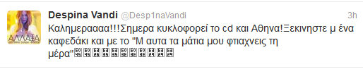 Η Δέσποινα Βανδή μας ενημερώνει μέσα απο το twitter της για την κυκλοφορία του καινούργιου της cd αλλά και ποιο είναι το αγαπημένο της τραγούδι…