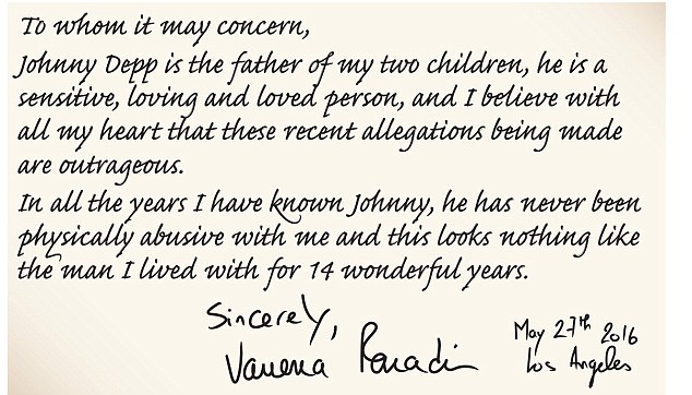Η Βανέσα Παραντί θέλησε να υποστηρίξει τον πρώην σύντροφό της και πατέρα των δύο παιδιών της, Τζόνι Ντεπ, με μια χειρόγραφη επιστολή που απέστειλε στο TMZ.