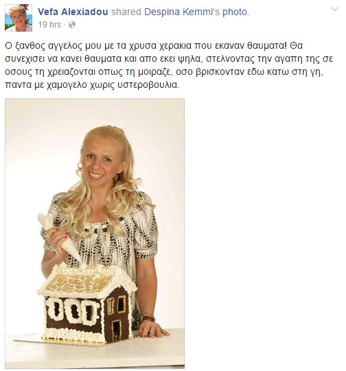 “Ο ξανθός άγγελός μου με τα χρυσά χεράκια που έκαναν θαύματα! Θα συνεχίσει να κάνει θαύματα και απο εκεί ψηλά, στέλνοντας την αγάπη της σε όσους τη χρειάζονται όπως τη μοίραζε, όσο βρίσκονταν εδώ κάτω στη γη, πάντα με χαμόγελο χωρίς υστεροβουλία”.