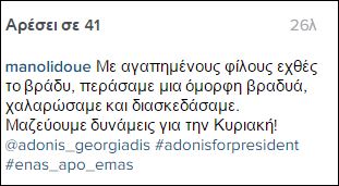 Συγκεκριμένα, η κ.Μανωλίδου έγραψε ότι «Με αγαπημένους φίλους εχθές το βράδυ, περάσαμε μια όμορφη βραδυά, χαλαρώσαμε και διασκεδάσαμε. Μαζεύουμε δυνάμεις για την Κυριακή!».