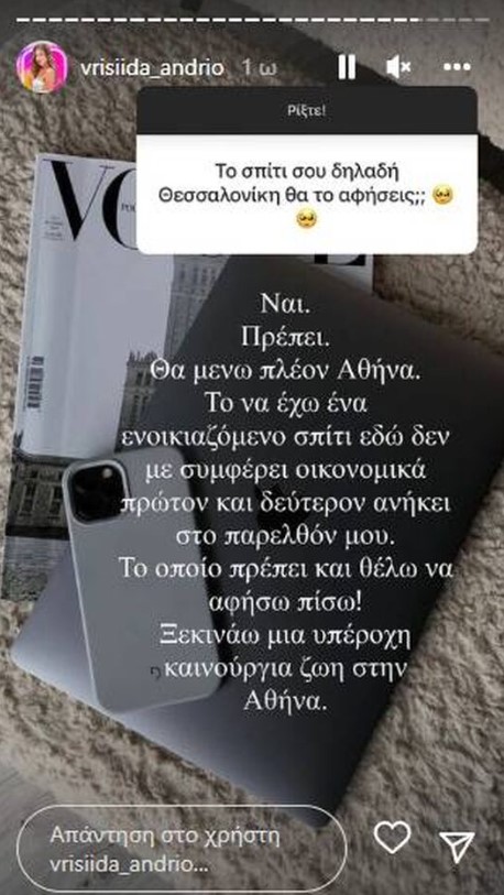 Η πρώην παίκτρια του Survivor και μοντέλο έκανε ένα Q&A στον προσωπικό της λογαριασμό στο Instagram και ένας follower της την ρώτησε αν έχει σκοπό να αφήσει το σπίτι της στη Θεσσαλονίκη.