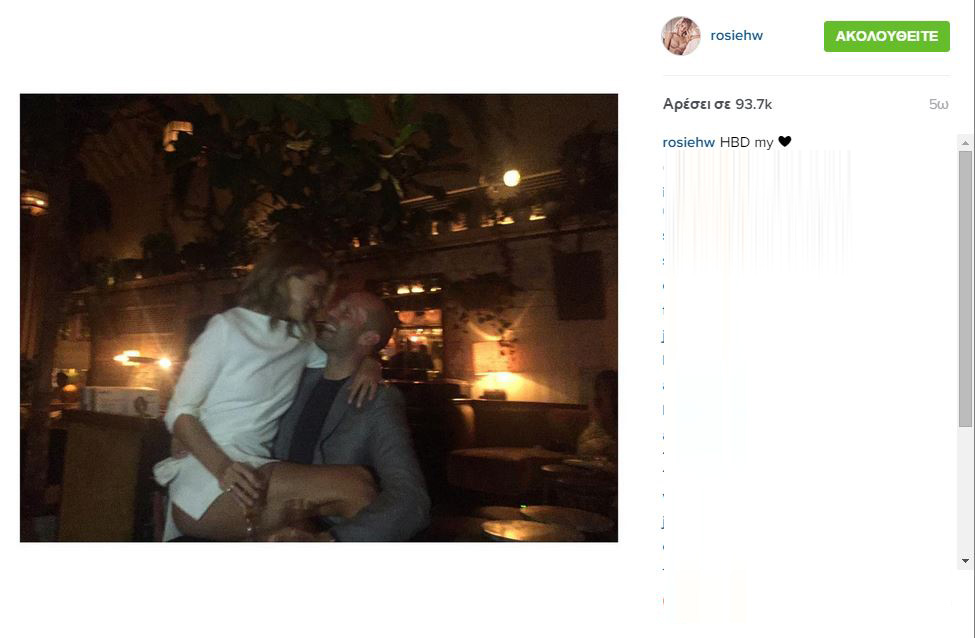 Το γνωστό μοντέλο Ρόζι Χάντινγκτον ευχήθηκε στον αγαπημένο της Τζέισον Στέιθαμ χρόνια πολλά για τα γενέθλιά του και πόσταρε μια τρυφερή φωτογραφία τους στο Instagram.