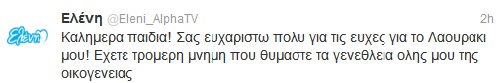 Γιορτινή μέρα για την Ελένη Μενεγάκη κι η χαρά της κρύβεται!Η Ελένη ευχαρίστησε όσους θυμήθηκαν ότι σήμερα γιορτάζει η μικρή της Λάουρα από το λογαριασμό της στο Twitter.Χρόνια πολλά!