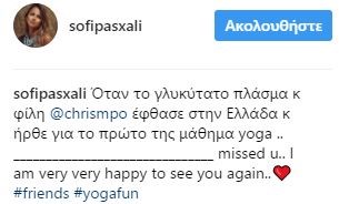 Μια αντίστοιχη φωτογραφία ανέβασε κι η Σόφη Πασχάλη στον δικό της λογαριασμό γράφοντας: “Όταν το γλυκύτατο πλάσμα κ φίλη Χριστίνα Μπόμπα έφθασε στην Ελλάδα κ ήρθε για το πρώτο της μάθημα yoga …missed u.. I am very very happy to see you again”.