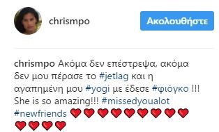 Μια αντίστοιχη φωτογραφία ανέβασε κι η Σόφη Πασχάλη στον δικό της λογαριασμό γράφοντας: “Όταν το γλυκύτατο πλάσμα κ φίλη Χριστίνα Μπόμπα έφθασε στην Ελλάδα κ ήρθε για το πρώτο της μάθημα yoga …missed u.. I am very very happy to see you again”.