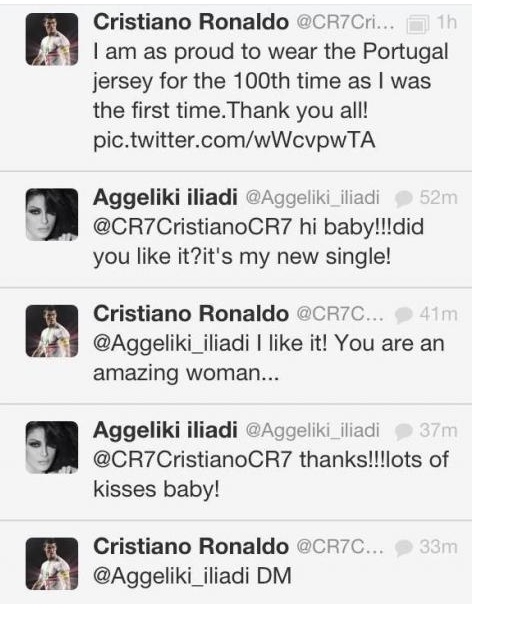 Λίγες μέρες μετά τη συμπλήρωση 100 συμμετοχών με τη φανέλα της Εθνικής Πορτογαλίας, ο Κριστιάνο Ρονάλντο, θα μπορούσε να το έχει γιορτάσει με έναν διάλογο στο twitter με την Αγγελική Ηλιάδη. Γιατί όχι; Ετσι τουλάχιστον πίστεψε η ίδια. Η Ελληνίδα τραγουδίστρια πάτησε το όνομα του CR7 στο twitter και μπήκε στο πρώτο αποτέλεσμα που της έβγαλε χωρίς να μπει στον κόπο να το ψάξει.