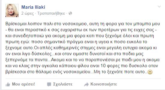 Στο νοσοκομείο βρίσκεται η Μαρία Ηλιάκη, όπως έγραψε στο προφίλ της στο facebook, καθώς ο πατέρας της έχει ένα πρόβλημα υγείας.