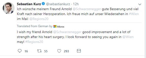 Ο Αυστριακός καγκελάριος Σεμπάστιαν Κουρτς ευχήθηκε στον πρώην πρωταθλητή του bodybuilding γρήγορα ανάρρωσή και «πολλή δύναμη». Σε ανάρτησή του στο Twitter ο Κουρτς πρόσθεσε ότι ανυπομονεί να τον συναντήσει τον Μάιο στη διάρκεια μιας προγραμματισμένης διάσκεψης για το κλίμα.
