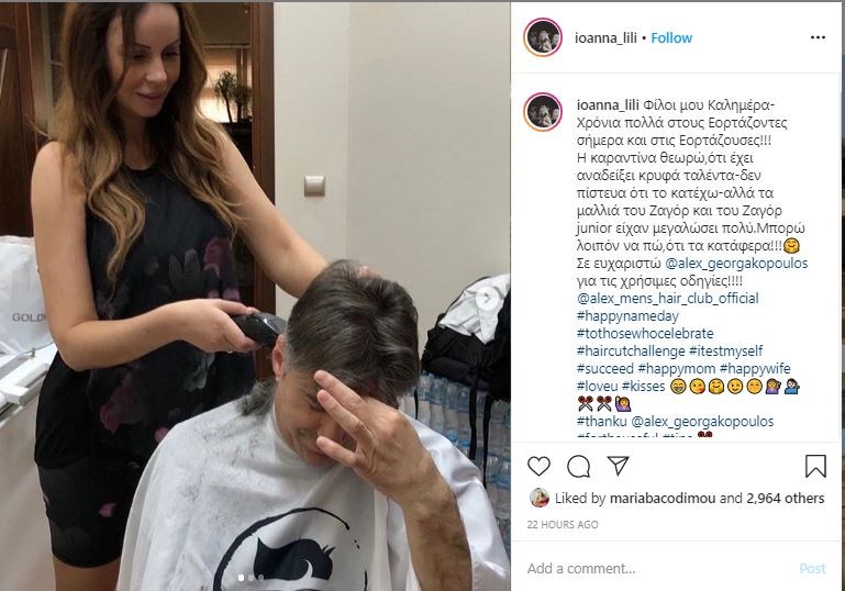 Το ταλέντο της στην κομμωτική ανέδειξε η Ιωάννα Λίλη στην περίοδο της καραντίνας. Συγκεκριμένα, η γνωστή παρουσιάστρια ανήρτησε στον προσωπικό της λογαριασμό στο instagram φωτογραφία στην οποία εμφανίζεται η ίδια να κουρεύει τον Θοδωρή Ζαγοράκη.
