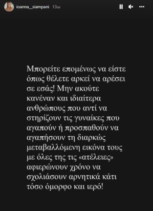 Μπορείτε επομένως να είστε όπως θέλετε αρκεί να αρέσει σε εσάς! Μην ακούτε κανέναν και ιδιαίτερα ανθρώπους που αντί να στηρίζουν τις γυναίκες που αγαπούν ή προσπαθούν να αγαπήσουν τη διαρκώς μεταβαλλόμενη εικόνα τους με όλες της τις «ατέλειες» αφιερώνουν χρόνο να σχολιάσουν αρνητικά κάτι τόσο όμορφο και ιερό» έγραψε η Ιωάννα Σιαμπάνη.
