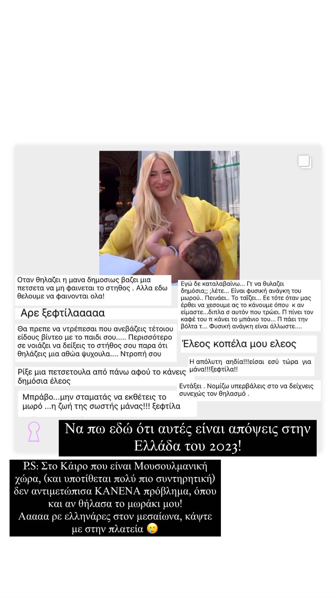 Ενώ λίγο αργότερα αναδημοσίευσε και ένα post το οποίο μιλούσε για τις επιθέσεις που δέχθηκε με αφορμή τον δημόσιο θηλασμό και σημείωσε με δύο λεζάντες ότι: «Να πω εδώ ότι αυτές είναι οι απόψεις στην Ελλάδα του 2023!». «P.S: Στο Κάιρο που είναι Μουσουλμανική χώρα, (και υποτίθεται πολύ πιο συντηρητική) δεν αντιμετώπισα ΚΑΝΕΝΑ πρόβλημα, όπου και θήλασα το μωράκι μου! Ααααα ρε Ελληνάρες στον Μεσαίωνα, κάψτε με στην πλατεία».