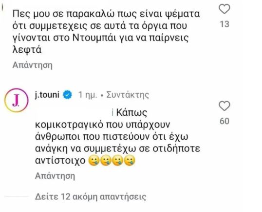 «Πες μου σε παρακαλώ πως είναι ψέματα ότι συμμετέχεις σε αυτά τα όργια που γίνονται στο Ντουμπάι για να παίρνεις λεφτά» έγραψε follower στην Ιωάννα Τούνη.
