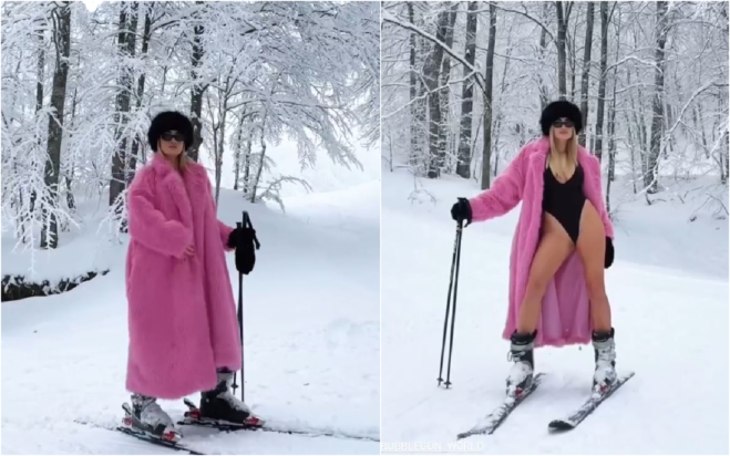 Όπως μπορούμε να δούμε, η influencer έπρεπε, για τις ανάγκες τις φωτογράφησης, να κάνει σκι ενώ φορούσε ένα μαύρο κορμάκι και ροζ μακριά γούνα.