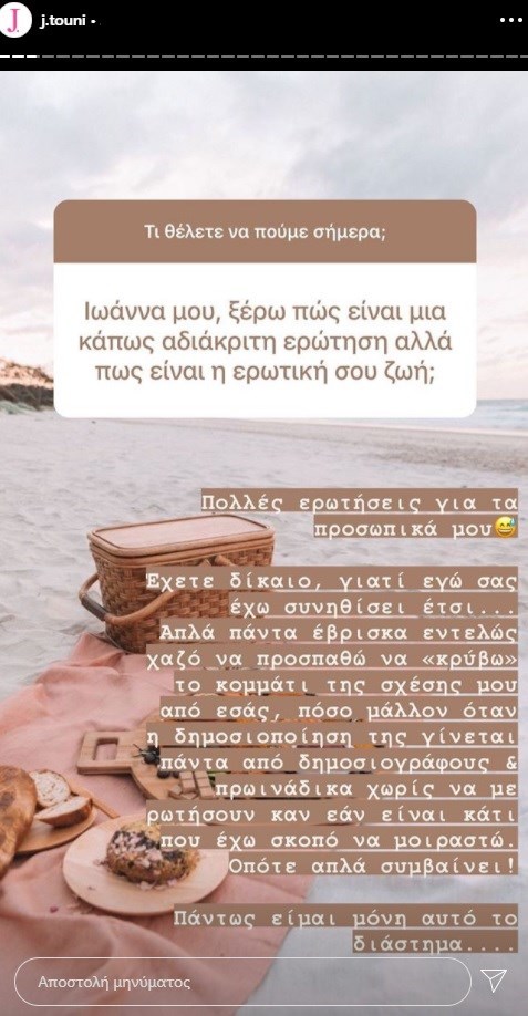 Όταν ένας follower την ρώτησε: «Ιωάννα μου ξέρω πως είναι μια αδιάκριτη ερώτηση αλλά πως είναι η ερωτική σου ζωή;», η Ιωάννα Τούνη απάντησε: «Πολλές ερωτήσεις για τα προσωπικά μου… Έχετε δίκαιο, γιατί εγώ σας έχω συνηθίσει έτσι… Απλά πάντα έβρισκα εντελώς χαζό να προσπαθώ να «κρύβω» το κομμάτι της σχέσης μου από εσάς, πόσο μάλλον όταν η δημοσιοποίηση της γίνεται πάντα από δημοσιογράφους και πρωινάδικα χωρίς να με ρωτήσουν καν εάν είναι κάτι που έχω σκοπό να μοιραστώ. Οπότε απλά συμβαίνει! Πάντως είμαι μόνη αυτό το διάστημα…».