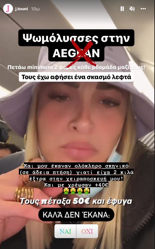 “Πετάω μίνιμουμ δυο φορές κάθε εβδομάδα μαζί τους. Τους έχω αφήσει ένα σκασμό λεφτά. Και μου έκαναν ολόκληρο σκηνικό (σε άδεια πτήση) γιατί είχα 2 κιλά έξτρα στην χειραποσκευή μου. Και με χρέωσαν +40 ευρώ. Τους πέταξα 50 και έφυγα. Καλά δεν έκανα;” έγραψε η Ιωάννα Τούνη σε story που ανέβασε στο Ιnstagram.