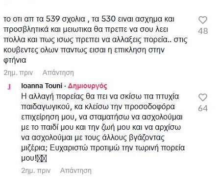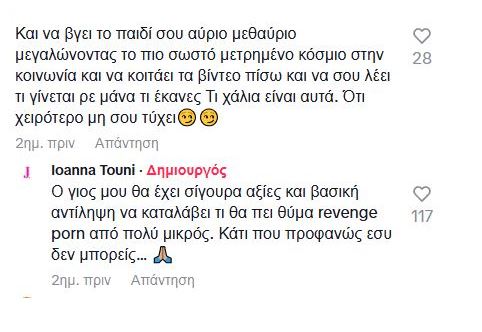 Από την πλευρά της, η Ιωάννα Τούνη απάντησε: «Ο γιος μου θα έχει σίγουρα αξίες και βασική αντίληψη για να καταλάβει τι θα πει θύμα revenge porn από πολύ μικρός. Κάτι που προφανώς εσύ δεν μπορείς…».