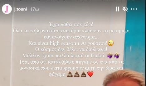 Όλα ξεκίνησαν όταν η εκρηκτική Ιωάννα Τούνη βρέθηκε με την παρέα της στο όμορφο νησί του Ιονίου όπου λόγω του ακραίου καύσωνα τα εστιατόρια είχαν κλείσει κατά τις μεσημεριανές ώρες. Η ίδια δήλωσε σοκαρισμένη από αυτό το γεγονός και μέσα από τον λογαριασμό της στο Instagram έσπευσε να σχολιάσει: «Έχω πάθει σοκ εδώ. Όλα τα ταβερνάκια εστιατόρια κλείνουν το μεσημέρι και ανοίγουν το απόγευμα. Και είναι high season 1 Αυγούστου. Ο κόσμος δεν θέλει να δουλέψει. Μάλλον έχουν πολλά λεφτά οι Παξοί. Τέλος πάντων, απ΄ότι καταλάβατε πήγαμε σε ένα από τα μοναδικά που λειτουργούσαν αυτή την ώρα και φάγαμε».