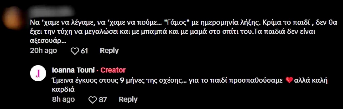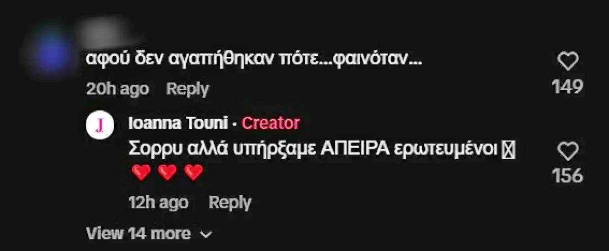Η Ιωάννα Τούνη δεν άφησε το σχόλιο αναπάντητο, απαντώντας με κατηγορηματικό τρόπο: «Sorry, αλλά υπήρξαμε άπειρα ερωτευμένοι».