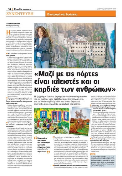 Μέσα από τους πίνακές της μας θυμίζει σκηνές μιας χώρας που χάθηκε και μέσω των εικόνων που περίτεχνα αποτυπώνει στον καμβά μάς αφηγείται με σεβασμό και αγάπη στιγμές της ένδοξης ιστορίας, τονίζοντας την αίγλη άλλων εποχών. Η εικαστικός μιλά στη Realnews λίγο πριν από την αναδρομική έκθεσή της, που θα ανοίξει τις πύλες της στις 4 Νοεμβρίου στην Αίθουσα Τέχνης του Ελληνοβρετανικού Συνδέσμου στην Πλατεία Κολωνακίου.