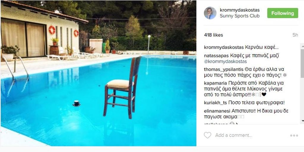 Ο ηθοποιός Κώστας Κρομμύδας, ανέβασε στον προσωπικό του λογαριασμό στο Instagram μία ιδιαίτερη φωτογραφία, όπου έχει τοποθετήσει πάνω στην πισίνα μία καρέκλα και ένα φλιτζάνι καφέ.