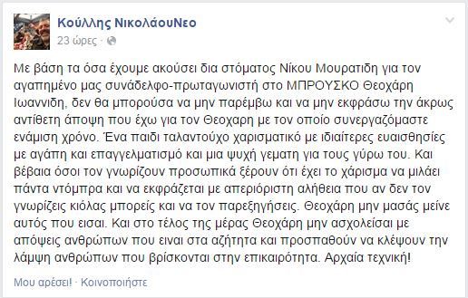 Ο πρωταγωνιστής του «Μπρούσκο», Κούλλης Νικολάου θέλησε να υποστηρίξει τον Θεοχάρη Ιωαννίδη, και μέσω facebook έγραψε χαρακτηριστικά: «Με βάση τα όσα έχουμε ακούσει δια στόματος Νίκου Μουρατίδη για τον αγαπημένο μας συνάδελφο-πρωταγωνιστή στο ΜΠΡΟΥΣΚΟ Θεοχάρη Ιωαννίδη, δεν θα μπορούσα να μην παρέμβω και να μην εκφράσω την άκρως αντίθετη άποψη που έχω για τον Θεοχάρη με τον οποίο συνεργαζόμαστε ενάμιση χρόνο. Ένα παιδί ταλαντούχο χαρισματικό με ιδιαίτερες ευαισθησίες με αγάπη και επαγγελματισμό και μια ψυχή γεμάτη για τους γύρω του. Και βέβαια όσοι τον γνωρίζουν προσωπικά ξέρουν ότι έχει το χάρισμα να μιλάει πάντα ντόμπρα και να εκφράζεται με απεριόριστη αλήθεια που αν δεν τον γνωρίζεις κιόλας μπορείς και να τον παρεξηγήσεις. Θεοχάρη μην μασάς μείνε αυτός που είσαι. Και στο τέλος της μέρας Θεοχάρη μην ασχολείσαι με απόψεις ανθρώπων που είναι στα αζήτητα και προσπαθούν να κλέψουν την λάμψη ανθρώπων που βρίσκονται στην επικαιρότητα. Αρχαία τεχνική!».