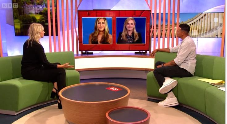 Τότε ο Jermaine Jenas, την διακόπτει για να κάνει μια ερώτηση στην Witherspoon, στην οποία αφήνει υπονοούμενα ότι η Aniston δεν αρέσκεται στο να ξυπνάει το πρωί.