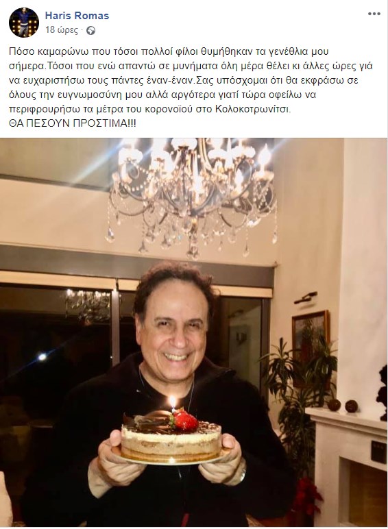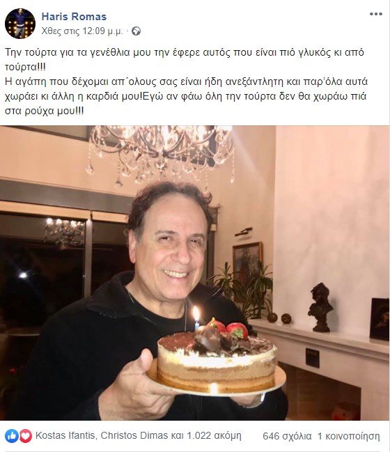 «Την τούρτα για τα γενέθλια μου την έφερε αυτός που είναι πιό γλυκός κι από τούρτα!!! Η αγάπη που δέχομαι απ´ολους σας είναι ήδη ανεξάντλητη και παρ’όλα αυτά χωράει κι άλλη η καρδιά μου!Εγώ αν φάω όλη την τούρτα δεν θα χωράω πιά στα ρούχα μου!!!», έγραψε ο Χάρης Ρώμας, με τους διαδικτυακούς του φίλους να σπεύδουν να του ευχηθούν χρόνια πολλά.
