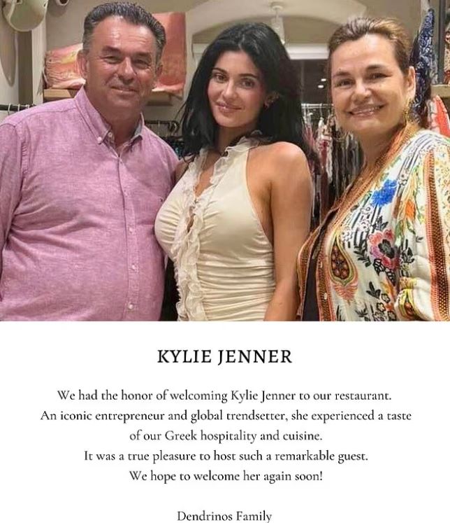 Λίγο αφότου η 27χρονη σταρ δείπνησε σε εστιατόριο στο χωριό Φισκάρδο, στην Κεφαλονιά, στις 12 Ιουλίου, οι ιδιοκτήτες Πολυχρόνης Δενδρινός και Τασία Δενδρινού έκαναν περήφανη ανάρτηση για την “πραγματική τιμή” να φιλοξενήσουν την “εμβληματική επιχειρηματία και παγκόσμια trendsetter”.
