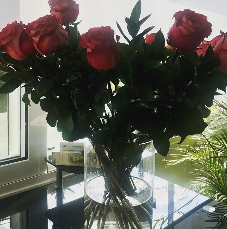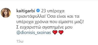 Η Καίτη Γαρμπή με τη σειρά της, τα φωτογράφισε και τα δημοσίευσε στον προσωπικό της λογαριασμό στο instagram γράφοντας χαρακτηριστικά: «23 υπέροχα τριαντάφυλλα! Όσα είναι και τα υπέροχα χρόνια που είμαστε μαζί! Σ’ ευχαριστώ αγαπημένε μου @dionisis_sxoinas».