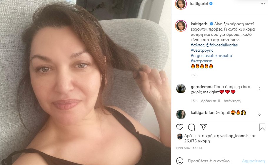 Η Καίτη Γαρμπή πόζαρε στον φακό χωρίς ίχνος μακιγιάζ και έγραψε: «Λίγη ξεκούραση γιατί έρχονται πρόβες. Γι’ αυτό κι ακόμα άσπρη και όσο για δροσιά… καλό είναι και το αιρκοντίσιον».