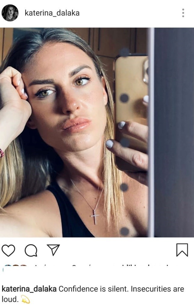 «Η αυτοπεποίθηση είναι σιωπηλή. Οι ανασφάλειες είναι ηχηρές» έγραψε η Κατερίνα Δαλάκα στην ανάρτησή της, την οποία συνόδεψε με μια selfie.